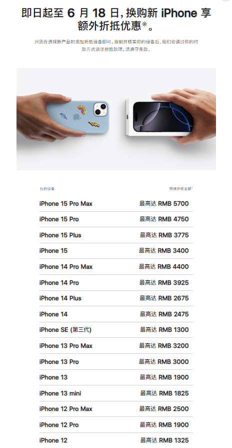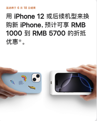 苹果官网显示:活动将于6月18日结束。其间,用iPhone 12或后续机型来换购新iPhone,预计可享RMB 1000元到RMB 5700元的折抵优惠。