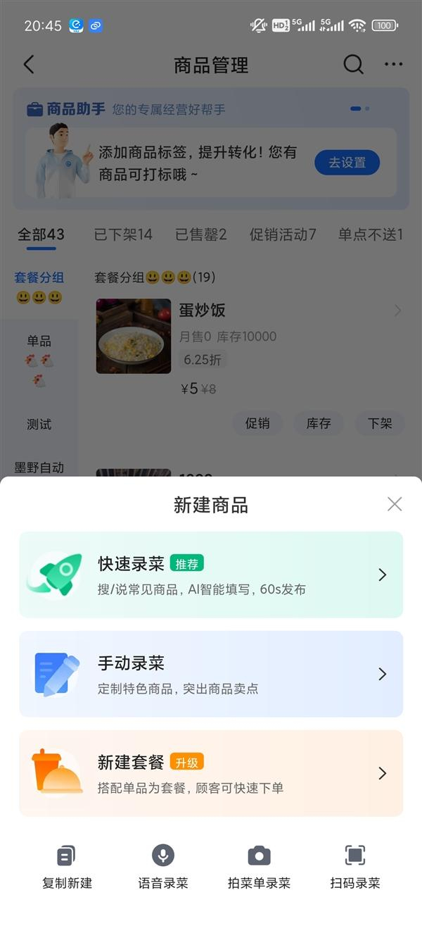 针对营业准备阶段,饿了么“智能店装”产品可以根据品类智能推荐装修风格,支持一键配置店铺各组件背景。如今已有超过21万商家使用该产品,平均装修时间只需要63秒。相比过去手动上传的繁琐流程,“智能发品”提供的快速录菜服务,支持拍照、语音录菜和AI智能填写,让单个菜品上架最快只需要50秒。菜品上架后,已有接近72%的商家选择使用“智能选品托管”服务,借助AI分析的菜品推荐建议进行菜单智能排序和首屏设计。