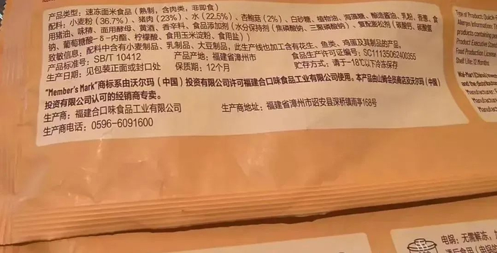 该产品包装显示,“馅料饱满,纯手工包制”,此外,产品说明提到,“本产品由山姆会员店及沃尔玛(中国)投资有限公司认可的经销商专卖”。