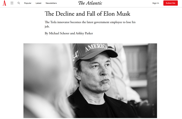 【环球网报道】据美国《野兽日报》、《新闻周刊》等媒体报道,美国《大西洋月刊》当地时间21日刊登了一篇题为《埃隆·马斯克的衰落与消亡》长篇报道,内容披露这位特斯拉掌门人在牵头美政府效率部工作期间,如何在特朗普政府中逐渐陷入“孤立”境地。这篇报道引发马斯克本人强烈不满,后者在社交平台X上连发多条帖文对该媒体展开攻势。