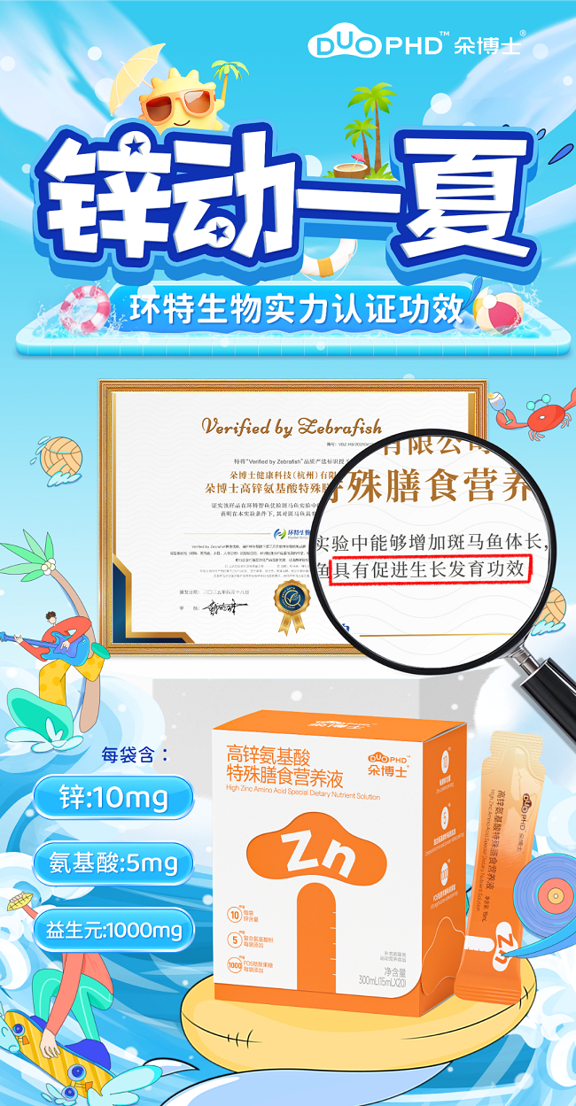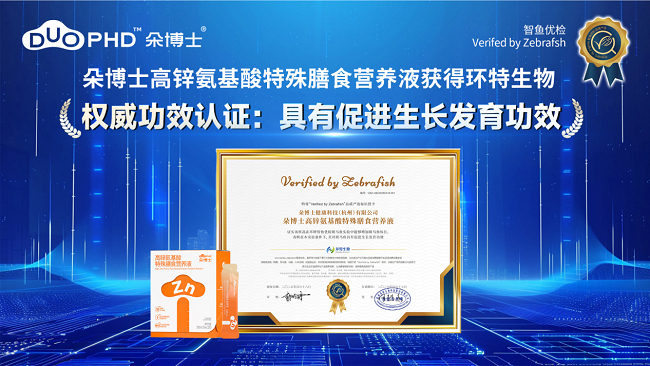 近日,朵博士公布两大产品通过环特生物斑马鱼实验,被证实产品品质卓越且真实有效。一款是关于脑健康与学生学习所需营养,一款则是关于生长发育的微量元素补充营养——高锌氨基酸特殊膳食营养液,后者实验结论显示“具有促进生长发育功效”。