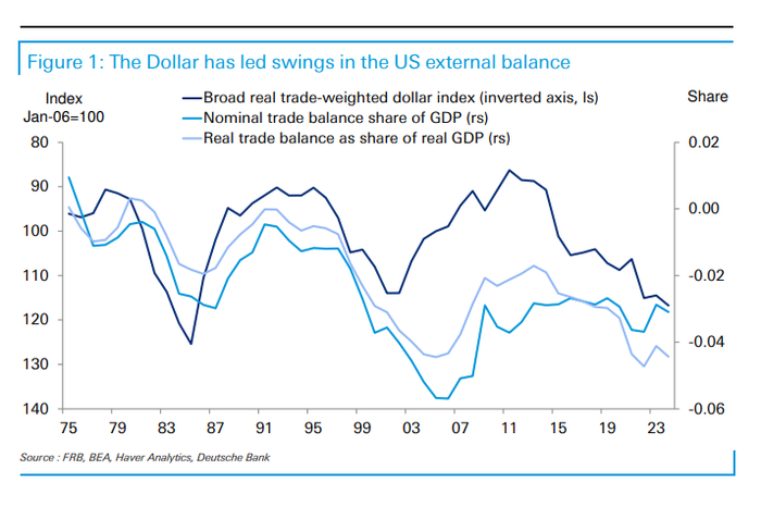 德银研报显示,美国长期贸易赤字的根源与美元实际汇率波动高度相关。