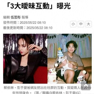 台媒表示,近年来二人互动暧昧,曾在情人节晒出同款玫瑰花、去同一家推荐制餐厅用餐,在餐厅老板晒出与彭于晏的合照中,彭于晏还拿着在蔡依林自拍中出现的同款玫瑰花。彭于晏主演电影《狗阵》在波特里小镇加映的前两月,蔡依林曾前往波特里小镇旅行,称这次旅行为“疗愈之旅,爱死了”。