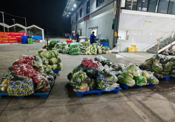 晚上9点多,货车驶入象右公司园区,货箱开启的瞬间,新鲜菜叶的清香混着田间露水的凉意扑面而来,仿佛刚从田间摘下。