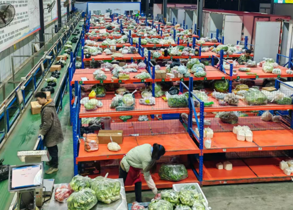 与此同时,园区分拣中心的夜班灯早已亮起,20余名员工正加班加点投入工作。对照平台实时更新的分拣清单,熟练地从货架取下刚卸货的白菜,快速剔除虫蛀叶、枯黄叶后称重分装,每个包装袋附上带溯源码的小票——这是它们进入十堰校园食堂的“通行证”。
