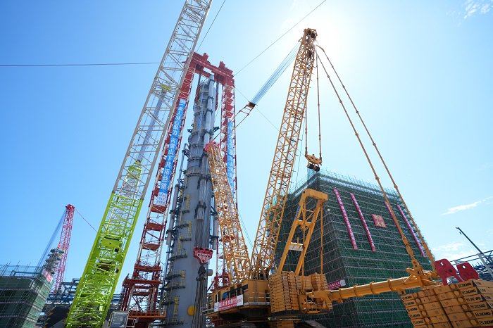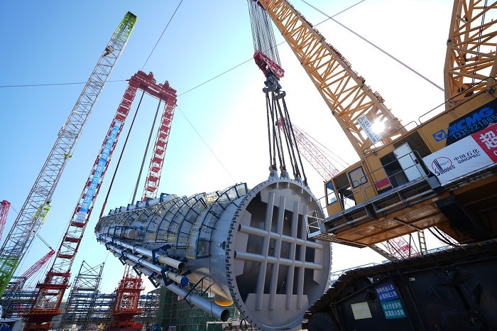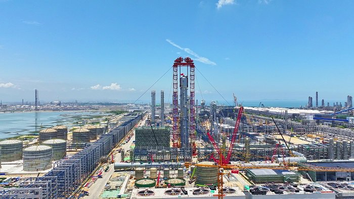 据悉,中沙古雷乙烯项目共有大型超限设备148台,总重计35000吨。作为全厂“最高”“最重”塔器,EO/EG洗涤塔的成功吊装,是该项目攻克一个又一个“至高点”的生动缩影。
