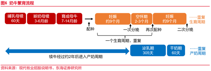 原奶供给调节至少需要2年时间。从奶牛繁育的流程来看,奶牛的生命周期较长,一只新生犊牛需要2年左右才能进入泌乳期,因此奶牛的产能释放具有滞后性。成母牛在14月龄左右会进行配种妊娠,在2岁左右时生产第一胎,进入产奶周期,周而复始,进入循环。奶牛的产犊间隔时间大约为365天,包括305天的泌乳期加上60天的干奶期。奶牛一般3-4胎以后产奶量达到高峰,5-6岁以后产能降低被淘汰。