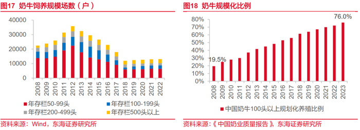 此外,在这一阶段,资本快速进入,奶牛存栏加速扩张,中小牧场大量退出,规模化快速提升。随着奶价的上涨,各个下游乳企加快对上游的布局,通过并购、参股、自建等方式,加强奶源控制,上下游深度绑定。例如,蒙牛乳业通过现代牧业、中国圣牧等布局上游牧场。伊利股份对中地乳业、澳优乳业进行收购,加强奶源布局。