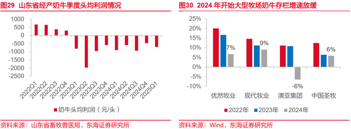2024年以来全国奶牛存栏持续去化,大型牧场增速放缓。2024年以来,生鲜乳价格走低导致牧场亏损严重,产能持续去化。根据国家统计局,2024年中国原料奶总产量4079万吨,同比减少2.8%,其中Q1和Q2同比分别+5.1%和+2.1%,Q3和Q4同比分别-5.8%和-9.0%,产能调整加速。以山东省为例,2023Q1开始,山东省经产牛开始进入亏损状态,2024年奶牛养殖全年12个月均亏损,亏损面超90%,2024年为近8年来最低效益。2025Q1奶价探底再创新低,奶牛养殖头均亏损达704元。据农业农村部监测数据,2024年全国荷斯坦奶牛存栏量同比-4.5%,奶牛存栏自2024年3月开始环比下降,截至2024年末,全国奶牛存栏量已调减至2023年7月水平。2025年1月份,奶牛存栏量同比-4.8%,奶牛存栏预计持续适应性回调。2024大型牧业集团奶牛存栏增速开始放缓或出现下滑,中小牧场存栏出现不同幅度的下降。预计2025年奶牛存栏加快调整节奏。