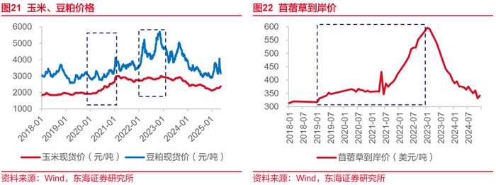 奶价再次上行周期:2018年9月至2021年8月,持续36个月,原奶价格涨幅28%。消费者健康意识提升催化乳制品需求,加上此前奶牛存栏大幅去化,奶价进入上行周期。与此同时,国际奶价上行,2020年开始豆粕、玉米等饲料成本上升,共同推动国内原奶价格上涨。