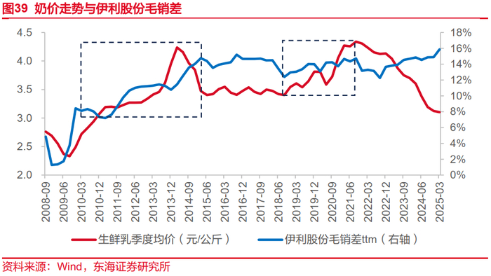 奶价对毛销差影响略有滞后,乳企费用投放精益化。在奶价上行阶段,伊利股份和蒙牛乳业毛销差均有不同程度提升,毛销差的提升趋势略滞后于奶价的上涨。2019年以后,头部乳企加快对上游奶源布局,使得2020年开始的奶价上行期,头部乳企的盈利优势更加明显。同时,近年来,乳企更加注重利润率的考核,精益化管理,优化渠道库存,对费用的投放趋于稳定,竞争趋于理性,在2022年至今的奶价下行期,也展现出了盈利韧性。