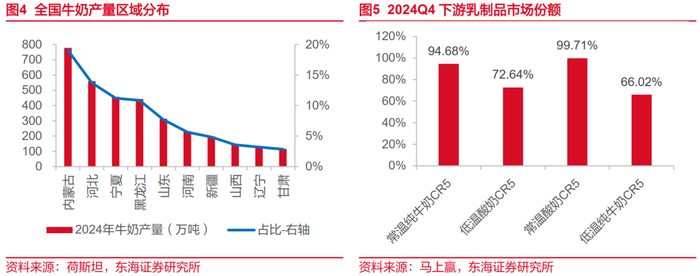 我国乳业上游分散,下游市场集中。近年来,全球乳业市场稳步增长。2023年,全球奶类产量为9.68亿吨,同比+1.7%,我国奶类产量4281.32万吨,占全球市场的4.4%。我国上游原奶市场较为分散,截至2020年,原奶产量行业前5大参与者的市场份额为15.5%。但产区集中,主要为东北、西北等地区。据荷斯坦统计,2024年全国原奶产量超过100万吨的主产省10个,生产原奶3372万吨,占全国82.7%。此外,我国乳业中下游市场高度集中,呈现双寡头和区域多强局面。截至2024Q4,常温奶市场CR5份额超过90%,以伊利股份和蒙牛乳业为主导。低温酸奶和低温纯牛奶市场CR5分别为73%和66%,区域型乳企通过差异化竞争占据较高市场份额。