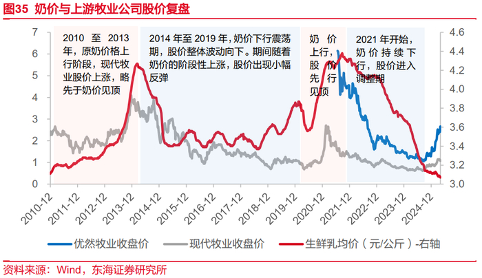 奶价与牧业公司股价具有同步性。从历史复盘来看,奶价的波动与上游牧业公司股价波动具有高度相关性。2010至2013年,原奶价格上行阶段,现代牧业股价略滞后于奶价开始上涨,2013年11月股价阶段性见顶,略先于奶价见顶(2014年2月),股价最高涨幅超过180%,奶价涨幅37%。2014年至2019年,奶价下行震荡期,股价整体波动向下。其中,2016年7月,随着奶价的阶段性上涨,股价出现小幅反弹,至11月股价涨幅104%,期间奶价季节性上涨5%。2019年至2021年,奶价上行期间,股价滞后上涨,先行见顶,期间股价涨幅175%,奶价涨幅20%。2021年9月开始,奶价持续下行,现代牧业与优然牧业股价均进入调整期。2024年8月开始,随着奶牛产能的持续去化,市场预期2025年奶价企稳,股价先于奶价反弹。从历史价格复盘来看,牧业公司股价的弹性远高于奶价涨幅,且随着市场对周期规律的认知提升,股价开始先于奶价提前反应。