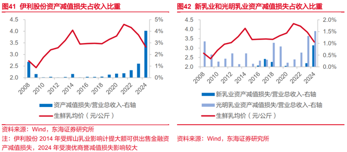 奶价下跌增加资产减值损失,奶价上行对业绩形成正贡献。奶价低迷使得上游牧场压力较大,生鲜乳喷粉增加提升存货减值压力。2022年、2023年、2024年伊利股份资产减值损失占营收的比重分别为0.64%、1.21%、4.04%。其中2024年受澳优商誉减值影响较大。新乳业、光明乳业2024年资产减值损失占营收比重分别为0.92%和1.52%,处于历史较高水平。在奶价景气年份,如2012-2014年,生鲜乳喷粉减少,牧场经营压力缓解,资产减值损失占营收比重较低,对业绩形成正贡献。2025年,随着奶价的逐步企稳,资产减值压力对业绩的负贡献预计将减少。