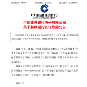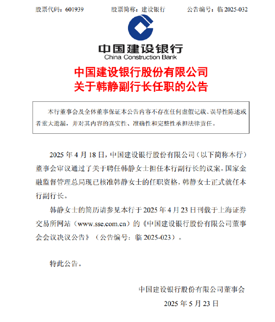 5月23日金融一线消息,建设银行发布公告,国家金融监督管理总局现已核准韩静的任职资格,韩静正式就任该行副行长。