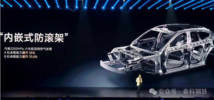 据发布会,该车内嵌2200Mpa小米超强钢热气胀管(内嵌式防滚架),即通过热气胀工艺内嵌到A柱和B柱里,A柱承载能力提升25%、B柱承载能力提升70.5%。