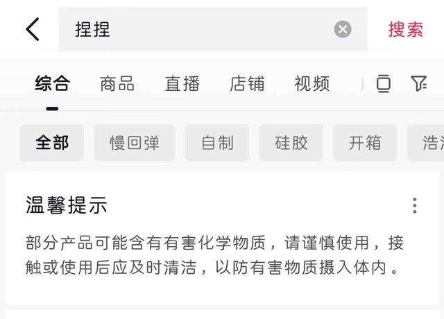 当前部分社交平台对捏捏做出了健康提示,搜索捏捏会显示“部分产品可能含有有害化学物质,请谨慎使用。”就捏捏玩具而言,市场监管目前还存在不力的情况,买家购买到不合格原料的捏捏也很难追溯维权,很多手作卖家对于制作捏捏中使用的这些化工合成品的危害性和自我保护方法更是一知半解,江苏省消保委此前发文提示消费者应选择资证齐全的正规渠道购买,商家也要坚持“安全第一”的原则,明确标注厂家、质量合格证等相关生产信息。