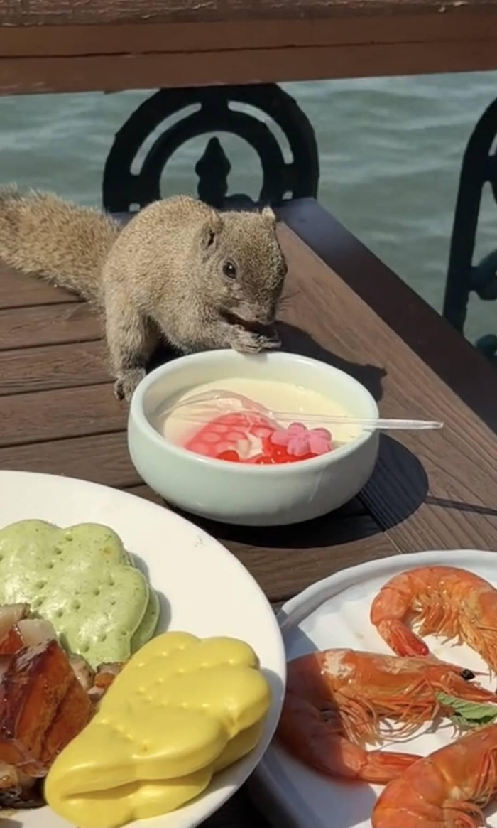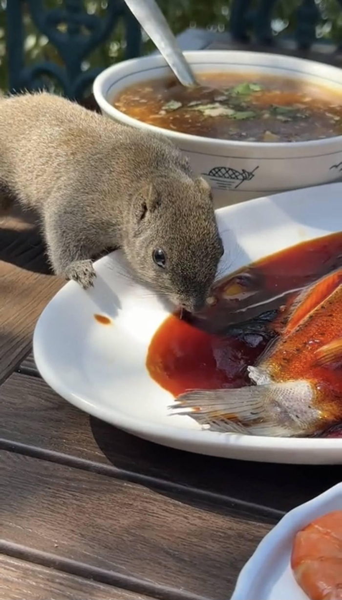 博主杭州西湖边用餐遇松鼠“蹭吃” 先尝甜品后吃西湖醋鱼