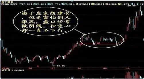 2、由于庄家想建仓,但是害怕别人跟风,所以经常做阴线,但是重心却一直上行。