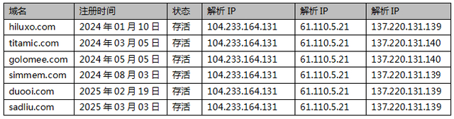 基于情报关联域名解析的IP地址,发现攻击者基于任务持续注册域名,并硬编码至加密的shellcode文件中,部分旧有域名也更换IP地址,样本分析期间所有域名又更换了两次解析IP地址。