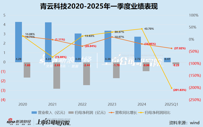 更何况,2025年一季度,青云科技的业绩表现再次恶化,一季度仅实现营业收入0.47亿元,同比骤降37.02%,归母净亏损0.23亿元,相比去年同期亏损扩大201.63%。