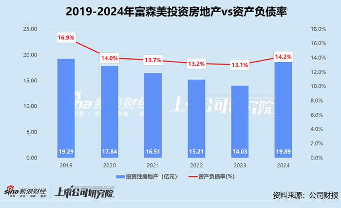 2019-2023年,富森美的投资性房地产由19.29亿元减少至14.03亿元,年均降幅约7-8个百分点。然而,2024年因天府项目完工转入,公司的投资性房地产重新提升至19.89亿元,同比激增41.8%,占非流动资产、总资产比例分别为44.7%、28.3%,与2023年相比增长13.5%、8.4%。