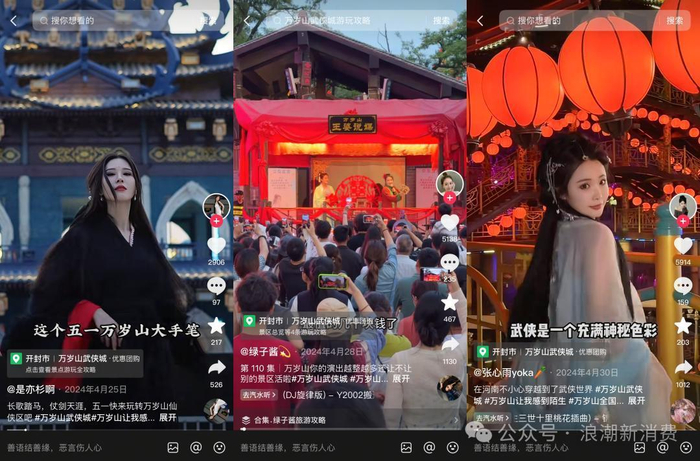 五一期间,平台有着海量游客的第一视角记录,如身披古装穿街走巷的打卡照、NPC互动的高光视频、孩子在花园奔跑的慢镜头……万岁山会密切关注这些内容的热度走势,一旦发现其上升趋势,便通过投流快速放大。