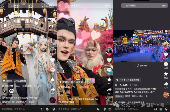 而这些接触到新鲜感的游客,也会自发的分享自己在景区遇见的趣味NPC或者表演,随手一发的抖音短视频,带来了几十万人的关注热度。