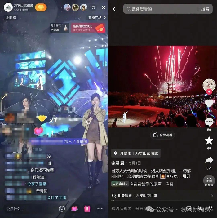 正式进入小长假之后,用户浏览时长增加,但注意力分散,内容覆盖的时长和范围至关重要。于是,万岁山节奏拉满,通过长时间直播+短视频铺量+话题词加热,官方账号实时输出现场盛况、互动内容及高光片段,引爆关注,为景区持续引流。