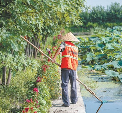近年来,辽宁省丹东市东港市孤山镇积极推进产业发展和美丽乡村建设。图为工作人员在孤山镇大姜家村清理池塘。王 哲摄(人民视觉)