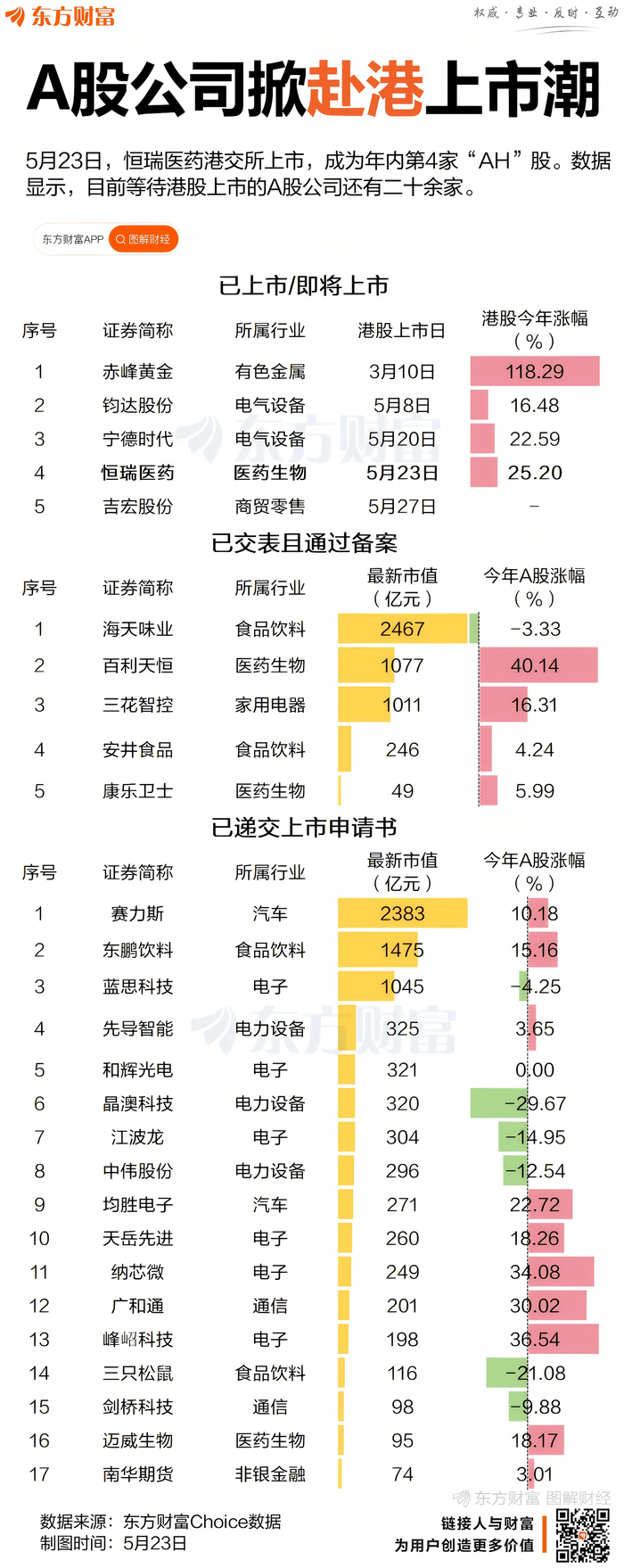 A股上市公司,正在掀起一波赴港的上市高潮。继宁德时代之后,5月23日(周五),医药巨头恒瑞医药正式登陆港交所,成为年内第4只“AH”股。上市首日,恒瑞医药港股暴涨25.20%,最新总市值达3642亿港元。5月27日(周一),吉宏股份将登陆港交所,成为年内第5只“AH”股。