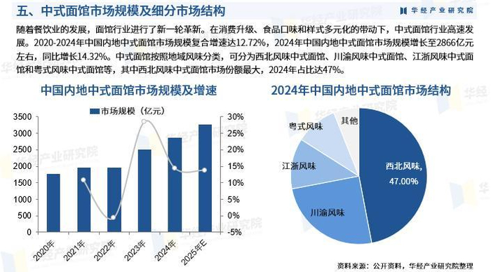 随着餐饮业的发展,面馆行业进行了新一轮革新。在消费升级、食品口味和样式多元化的带动下,中式面馆行业高速发展。2020-2024年中国内地中式面馆市场规模复合增速达12.72%,2024年中国内地中式面馆市场规模增长至2866亿元左右,同比增长14.32%。中式面馆按照地域风味分类,可分为西北风味中式面馆、川渝风味中式面馆、江浙风味中式面馆和粤式风味中式面馆等,其中西北风味中式面馆市场份额最大,2024年占比达47%。