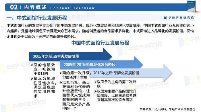 中式面馆行业的发展主要经历了原生态发展阶段、规范化发展阶段和品牌化发展阶段。中国中式面馆行业从传统街边小店起步,凭借地域特色面食满足大众基本需求。随着消费者的食品需求多样化,中式面馆进入品牌化的发展阶段,面馆企业现处于以面为主要产品的面馆升级阶段。