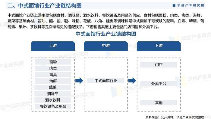 中式面馆产业链上游主要包括食材、调味品、酒水饮料、餐饮设备及用品的供应。食材包括面粉、肉类、禽类、海鲜、蔬菜等基础食材,酱油、醋、盐、糖、味精、花椒、八角、桂皮等调味料是中式面馆不可或缺的配料,白酒、啤酒、葡萄酒、果汁、茶饮料等是面馆常见的搭配饮品。下游销售渠道主要包括门店销售和外卖平台。