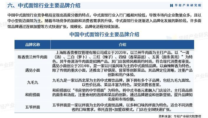 中国中式面馆行业竞争格局呈现出高度分散的特点,中式面馆行业入行门槛相对较低,导致市场内企业数量众多,且以中小型街边面馆为主。随着市场竞争的加剧和消费者需求的升级,中式面馆行业逐渐进入品牌化发展的新阶段。许多面馆品牌通过连锁加盟等方式快速扩张,规模化、品牌化进程持续加速。