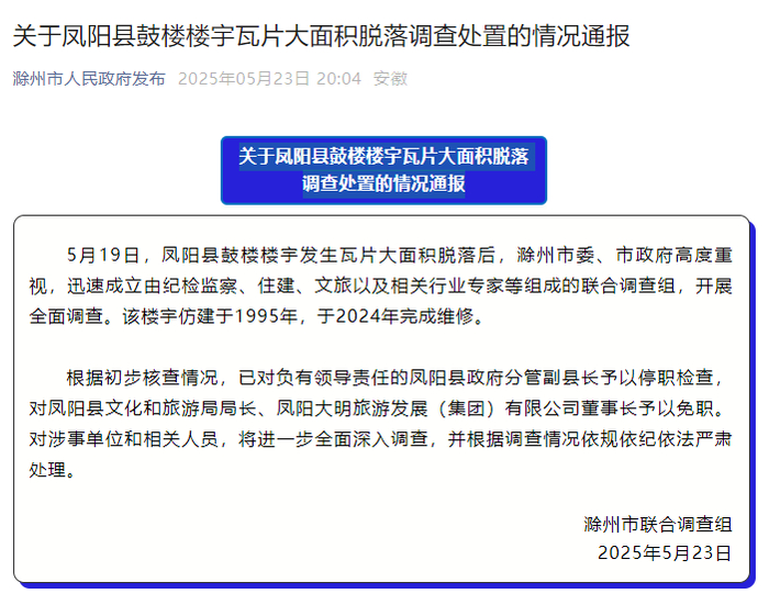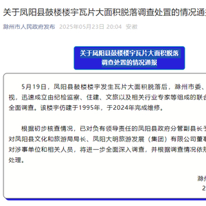 5月19日,凤阳县鼓楼楼宇发生瓦片大面积脱落后,滁州市委、市政府高度重视,迅速成立由纪检监察、住建、文旅以及相关行业专家等组成的联合调查组,开展全面调查。该楼宇仿建于1995年,于2024年完成维修。