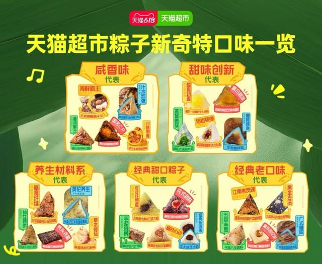 除了主推地域特色,粽子、月饼、青团等传统美食“卷”口味也不是一天两天了,像前些年还算新口味的榴莲冰粽,俨然成为今年夏季主流款粽子。数据显示,天猫超市在售的粽子口味超过100种,和传统口味粽子相比,新奇特口味粽子的增长更快。