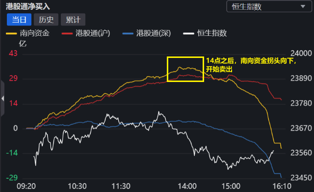 仔细看下午资金走向的话,下面两张图,一张是沪深300ETF的,14点之后有一波卖盘(只有华泰柏瑞的多一点,其他三只千亿级别的沪深300ETF,全天成交都不到10亿);另一张是南向资金的,也是14点左右,开始出现拐点,资金开始转为卖出。