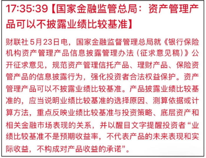 不过,今晚总局出了一个重磅的规定,下图,但是财联社抓新闻的,标题抓错了,这条新闻的核心是,理财未来设定业绩基准的时候,必须要有明确的测算依据等,也就是说,不能瞎设一个虚高的业绩基准,去“框钱”了——理论上,这会缩小理财和存款的吸引力差距,减缓存款流向理财。