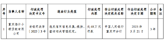 海尔小额贷款公司被罚48万元:违反信用信息采集、提供、查询相关管理规定
