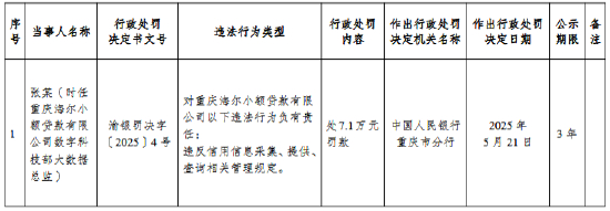 5月23日金融一线消息,中国人民银行重庆市分行行政处罚决定信息公示表显示,重庆海尔小额贷款有限公司因违反信用信息采集、提供、查询相关管理规定,被罚款48万元。张某(时任重庆海尔小额贷款有限公司数字科技部大数据总监)对上述违法行为负有责任,被罚款7.1万元。