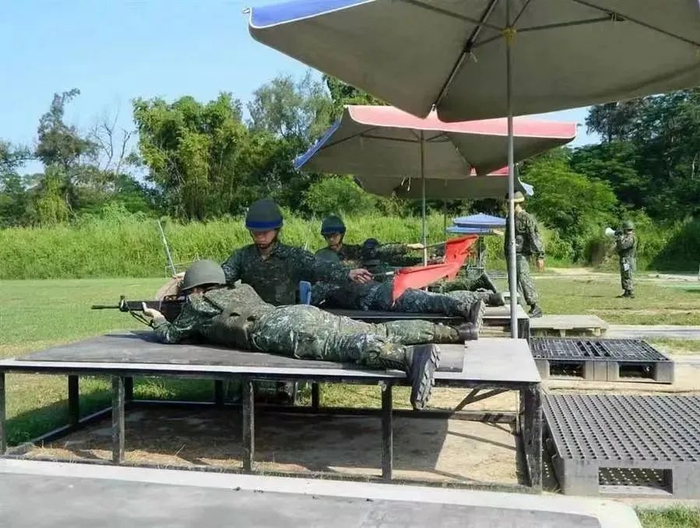 台军士兵在太阳伞下训练射击 被台媒讽刺为“草莓兵”