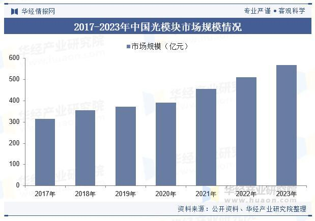 光模块又称光收发一体模块,是实现光通信系统中光信号和电信号转换的核心部件,主要由光器件(光发射器、光接收器)、功能电路和光接口等构成,主要作用就是实现光纤通信中的光电转换和电光转换功能。近年居家学习和工作方式发生了转变,消费者对更快、更普遍、更高可靠性网络的需求愈发强烈,光模块市场规模也在快速增长,2023年市场规模达到了568.6亿元,同比增长11.12%。