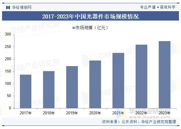 随着光通信行业的发展和技术进步,带宽需求不断提升,设备集成商和电信及数据中心运营商不断加大对光通信网络和设备投入,从而带动光器件行业的发展,2017年我国光器件市场规模约为137亿元,2023年市场规模来到了273亿元,复合增长率约为12.18%。