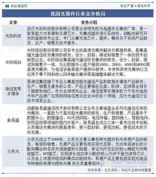 本文节选自华经产业研究院发布的《2023年中国光器件行业发展现状及趋势分析,业内企业纵横拓展,行业将持续整合态势「图」》,如需获取全文内容,可进入华经情报网搜索查看。