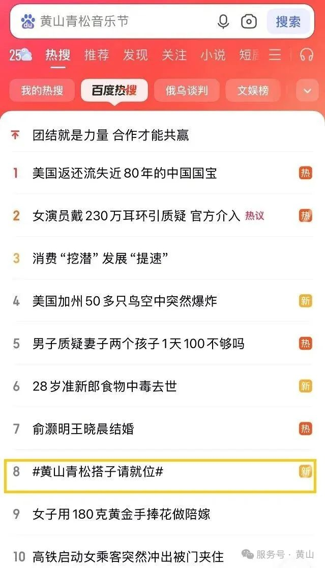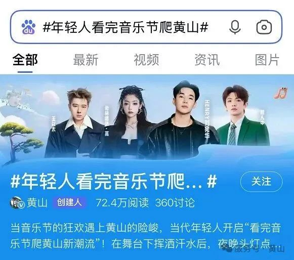两日演出话题不断,#黄山青松搭子请就位#、#安徽黄山音乐节偶遇徐霞客#等成为文化新潮流;#年轻人看完音乐节爬黄山#开创音乐+旅行新模式,#黄山青松音乐节宠粉天花板#频频获网友点赞。