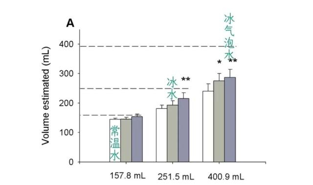 研究人员让受试者们使用吸管杯喝饮料,并且不能用手拿水杯,然后让受试者预估自己喝了多少饮料。结果显示,喝冰气泡水的人预估的比常温水多 22%。