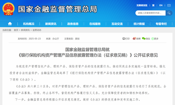 5月23日,金融监管总局就《银行保险机构资产管理产品信息披露管理办法(征求意见稿)》(下称《办法》)向社会公开征求意见。