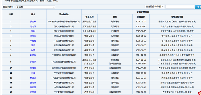 值得关注的是,广发证券李佳佳与财信证券蒋序全因紫鑫药业非公开发行项目“旧责新究”。二人虽已转任一般证券业务资格,但其在东吴证券任职期间作为签字保代,未审慎核查,持续督导期间亦未履行勤勉义务,最终导致机构与个人双罚,体现了监管“追溯追责”的严要求。
