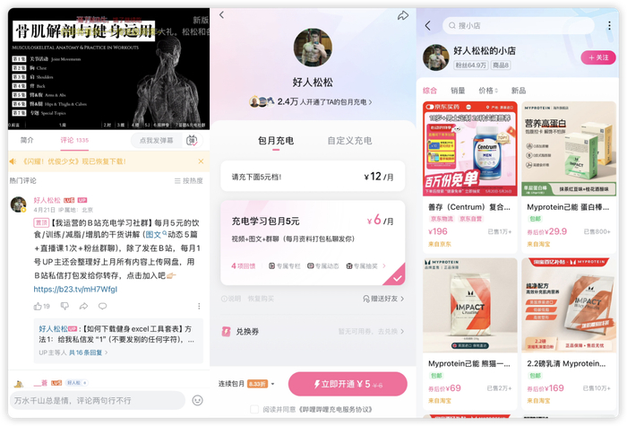 以健身UP主“好人松松”为例,他通过充电功能提供定制化课程,吸引2.6万人付费,按照6元一个月费用计算,这部分收益达到15.6万元,同时在视频蓝链中为充电社群打广告,还带货蛋白粉等健身产品。粉丝为他的专业内容付费,也在为这份信任持续充值。